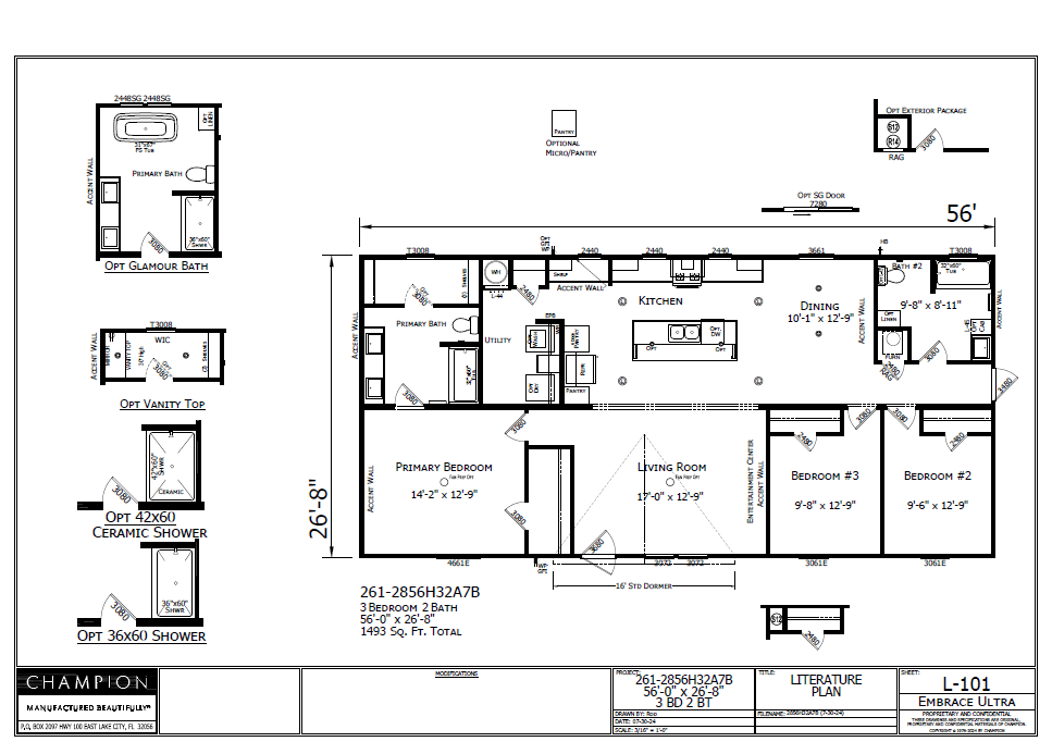 This home features wall panel with batten strips, vinyl flooring throughout and overhead ducts. The Embrace series features standard upgardes like 42 inch cabinets, accent walls and trim, and upgraded front door.