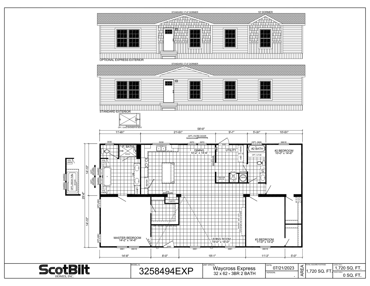 This floorplan is built in Waycross, GA and is part of the Waycross Express Series. This floorplan features standard features like a 60 x 42 Palisades Shower in Main Bathroom with Rain Shower Head and full tile backsplash in kitchen.